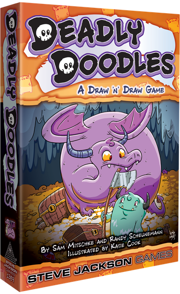 In Deadly Doodles, 1-4 players simultaneously draw paths through a dangerous dungeon. Draw cards, draw a path through your dungeon, and rack up points! Collect loot and fight monsters...or run away screaming! Can you defeat the dragon for the big score?